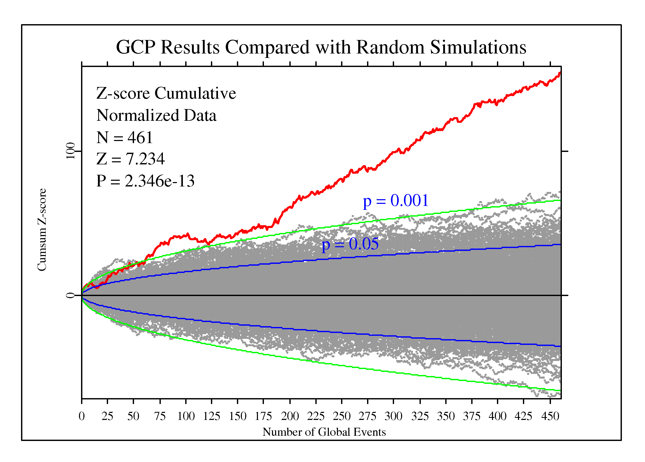 It is important to compare the experimental data with an appropriate control population. There are a number of possible ways to do this. We automatically generate pseudorandom data two days after the real data have been recorded, and in principle, we could compare the analysis of each event against its pseudorandom counterpart. A more comprehensive procedure is to generate a large population of controls, and that can be done by resampling from the actual data that are not used in the formal series, or by simulations using a high quality random number generator. The figure below displays a population of 500 simulated formal series, and shows the real data against this background.