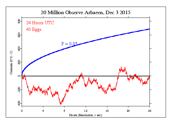 The following graph is a visual display of the statistical result. It shows the second-by-second accumulation of small deviations of the data from what’s expected. Our prediction is that deviations will tend to be positive, and if this is so, the jagged line will tend to go upward. If the endpoint is positive, this is evidence for the general hypothesis and adds to the bottom line. If the endpoint is outside the smooth curve showing 0.05 probability, the deviation is nominally significant. If the trend of the cumulative deviation is downward, this is evidence against the hypothesis, and is subtracted from the bottom line. For more detail on how to interpret the results, see The Science and related pages, as well as the standard caveat below.