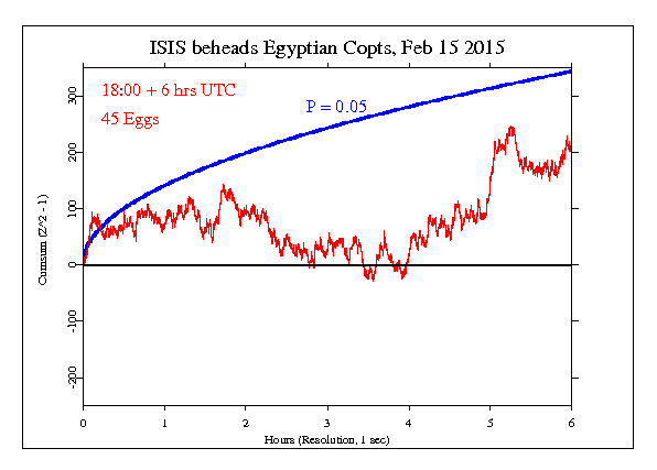 The following graph is a visual display of the statistical result. It shows the second-by-second accumulation of small deviations of the data from what’s expected. Our prediction is that deviations will tend to be positive, and if this is so, the jagged line will tend to go upward. If the endpoint is positive, this is evidence for the general hypothesis and adds to the bottome line. If the endpoint is outside the smooth curve showing 0.05 probability, the deviation is nominally significant. If the trend of the cumulative deviation is downward, this is evidence against the hypothesis, and is subtracted from the bottom line. For more detail on how to interpret the results, see The Science and related pages, as well as the standard caveat below.