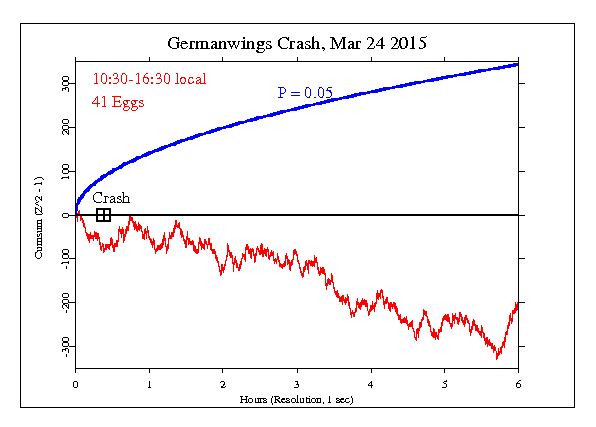 The GCP hypothesis was set for 6 hours beginning at 10:30 local time, to include about 23 minutes before the crash (9:30-15:30 UTC). The result is Chisquare 21399.387 on 21600 df, for p = 0.833 and Z = -0.965.