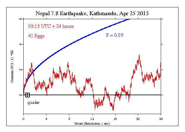 The GCP event was set for 24 hours, as usual for large quakes with major destruction and loss of life. It begins at 11:00 local time, 41 minutes before the main temblor (05:15 UTC). The result is 86662.736 on 86400 df, for p = 0.263 and Z = 0.633.