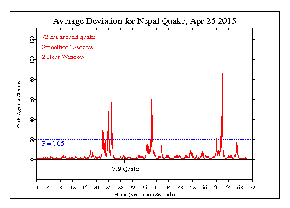 Next we look at the raw data, smoothed to reduce the high frequency noise. Here we look at a 72 hour period surrounding the main 7.9 temblor. The graph shows the odds against chance for deviations that show as spikes against the null background. An hour-long disturbance appears to begin about 2 hours before the quake, and two more large spikes appear afterwards.