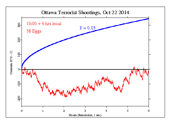 The GCP hypothesis was set for 10:00 AM to 16:00 local time (14:00 to 20:00 GMT), to include 6 hours during which the news spread. The result is Chisquare 21585 on 21600 df, for p = 0.528 and Z = -0.071.