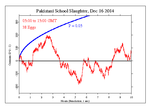 The GCP hypothesis was set for 10 hours beginning just before the attack at 05:00 GMT, ending at 15:00. The result is Chisquare 36070 on 36000 df for p = 0.396 and Z = 0.263.