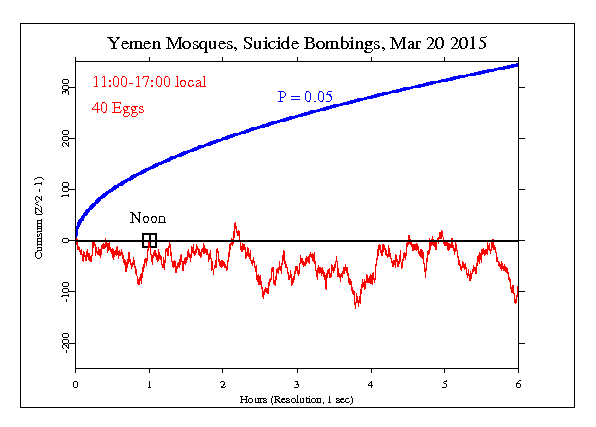 The GCP event was set for 11:00 to 14:00 local time, intending to include the time of noonday prayers as well as some hours for the news to spread. The result is Chisquare 21490.193 on 21600 df, for p = 0.701 and Z = -0.526
