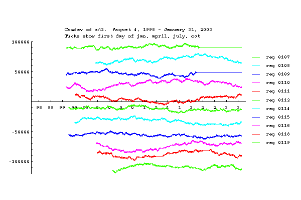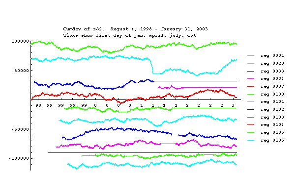 On a few days, the network produced faulty or incomplete data. These occurred during the first weeks after the GCP began operation and during hacker attack in August 2001. The days August 11, 25, 31 and September 6 have less than 86400 seconds of data. These days are retained in the database. For the days August 5-8, inclusive, the data consists mostly of nulls for all REGs. These days have been removed from the standardized data.