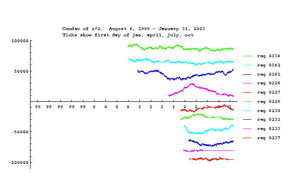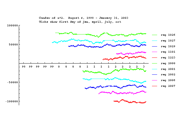 Again, the standardization removes data defects and leaves clean data fluctuations. The device variance is the sample variance of individual reg trials for 1-sec blocking. The device variance probability envelopes are expanded because the degrees-of-freedom are proportional to the number of REGs online, which grows with time. Note that the device variance cumulative deviation trace ends at zero, as expected for standardized data.