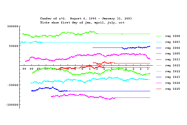 The following graph shows the 8-year history of online REGs in the network. Each blue line represents the period of time a single reg was reporting data. The black trace is the daily sum of online REGs. The red trace is the daily sum of online REGs minus null trials (see also the section on nulls, below). The graph shows the long running history of some nodes as well as the fair number of nodes with short lives. We also can see the actual network growth and how the network changes even with a more or less constant node number. The relatively flat trend beginning in 2004 reflects a decision to maintain the network at about 65-70 nodes, a number that is manageable with available resources.