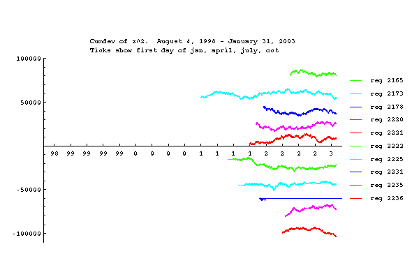 Here we can see the effect of standardization. The network Z is the mean trial z-score divided by the square root of the number of trials (i.e., the Stouffer Z). The network Z squared shown here (Network Zsqr) is the variance of the network Z with respect to a theoretical mean of zero. Note that the network variance cumulative Z ends off zero because the weighting of REGs is not strictly uniform in the calculation of the Z statistic.
