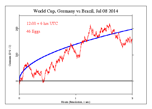 While we have found that sporting events rarely correspond to big deviations in the GCP data, this was such an unusual and engrossing moment in the World Cup that a formal event was set for the period of the match, from 20:00 to 22:00 UTC. The result is Chisquare 7359.4 on 7200 df for p = 0.093 and Z = 1.324.