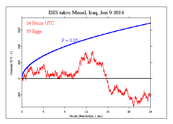 The troubles in Iraq are far from over. Over the first few months of 2014, an increasing amount of violence has destroyed hopes for a normalization. A new organized Islamic insurgency, apparently the offspring of Al Qaeda and the war in Syria, has come to the fore, as ISIS, the Islamic State of Iraq and Syria. Their activities have become well organized and effective, and they have progressively captured more territory against weak opposition from the government troops. This is one of those long simmering disasters which seem to capture our attention around the world, but without a sharply focused time period. I decided that the capture of Mosul, one of Iraq's large cities, and the "capital of northern Iraq", would serve as a reasonable sample. Even that event was spread out, but June 9 2014 seemed to be representative.