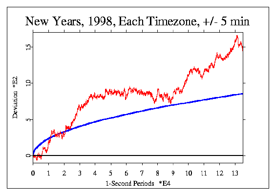 | NEW YEAR TRANSITION One of the most obvious events for which some predictions might be made is the relatively world-wide celebration of the New Year transition. The primary prediction is for an accumulation of deviations across all timezones, but first we may want to look at the context. A global perspective of the GCP network activity may be gained from a look at the cumulative deviation of Z² (Chisquare) for the last day of 1998 (UTC), where we see apparently random fluctuation with a slight negative trend (see graph below), ![]() and the first day of 1999 (UTC), which shows a highly significant composite deviation (Chisquare is 971.4 on 863 df, p = 0.0058) (see graph below).
